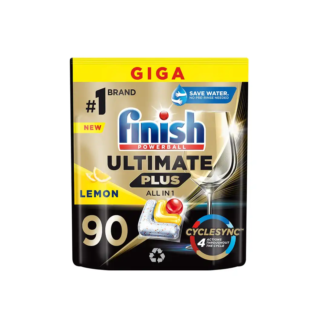 Nettoyage ultra-puissant et brillance longue durée. Tablettes Finish Powerball Ultimate Lemon 90 pour lave-vaisselle, facile à utiliser, parfum citron frais, vaisselle sans traces.