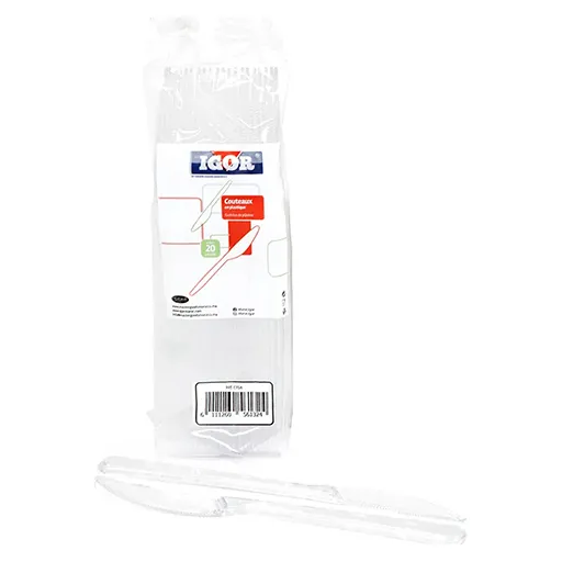 Pratique et jetable: 20 couteaux en plastique blanc, solides et légers. Idéal pour pique-niques, repas rapides — prise en main confortable.