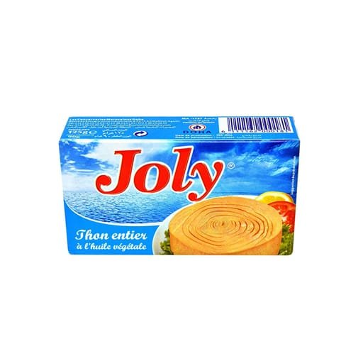Thon entier à l’huile végétale Joly 125g, chair tendre et riche en goût; idéal en salade, tartine ou plat chaud — saveur fondante et texture ferme.