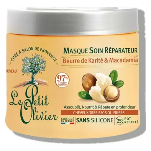 Nourrissez et réparez vos cheveux avec le masque réparateur au beurre de karité & macadamia de le petit olivier.