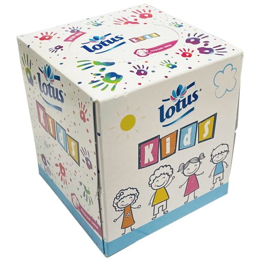Douceur extra pour peaux sensibles. Mouchoirs Lotus Kids 80, absorbants et hypoallergéniques, idéals pour le nez des enfants, texture douce et parfum léger.