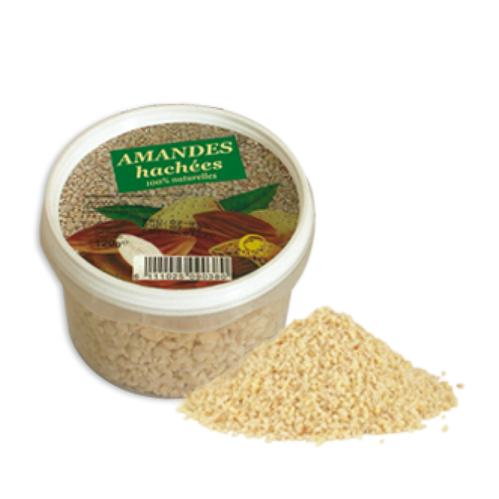 Croquant et riche en goût — amandes hachées Macao 100 g, parfaites pour décorer gâteaux, tartes et biscuits, apportent saveur et texture.