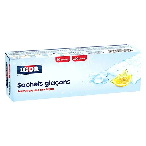 Glace instantanée et pratique — Emballages & Conservations: Sachets Glaçons Igor (10) pour rafraîchir boissons et aliments; fond lent, fraîcheur garantie.