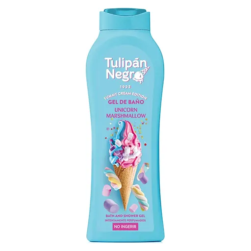 Nettoie en douceur et hydrate la peau. Tulipan Negro Unicornio Marshmallow Gel 650 Ml, gel onctueux au parfum marshmallow, mousse généreuse pour une douche gourmande et parfumée.