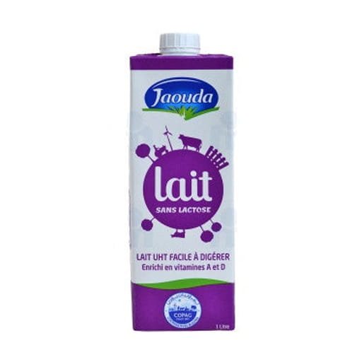 Sans lactose, digestion facile — Jaouda Lait UHT 1L. Idéal chaud ou froid, café, cuisine et desserts, goût doux et onctueux. Pratique, longue conservation.